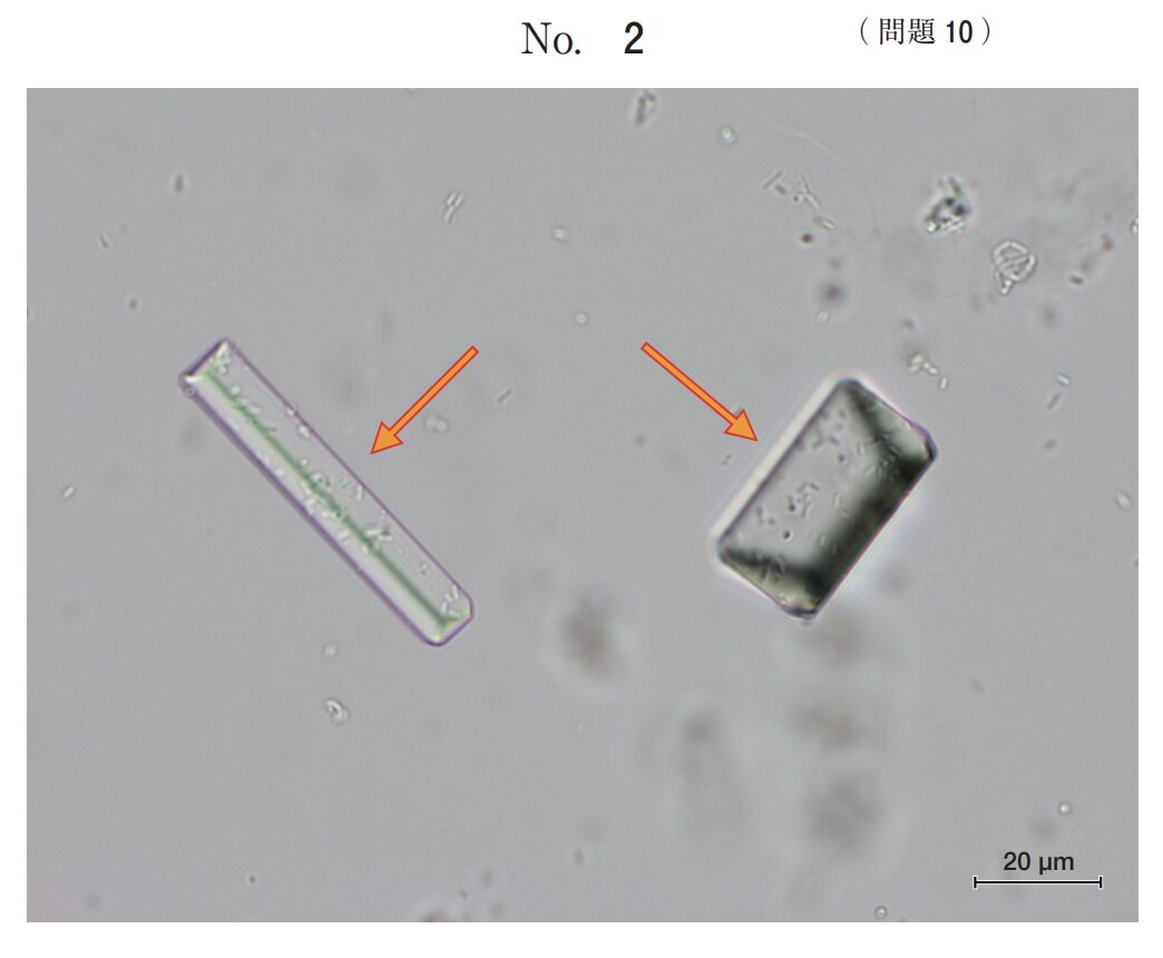 【第70回 午後 問10】尿沈渣の無染色標本(別冊No.2)を別に示す。矢印で示した結晶はどれか。