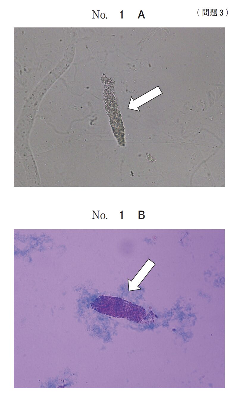 【第70回 午前 問10】尿沈渣の無染色標本(別冊No.1A)とSternheimer染色標本(別冊No.1B)を別に示す。この構造物はどれか。