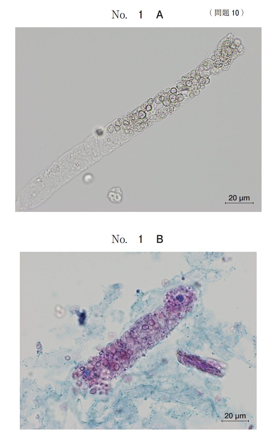 - 他の選択肢:前問の解説を参照してください。封筒状のシュウ酸カルシウムなどとは明らかに形が異なりますね。